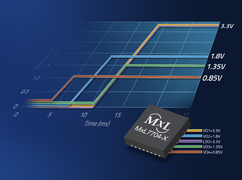 Микросхема MxL7704 включает в себя четыре синхронных понижающих преобразователя которые могут обеспечить общее питание, питание памяти, цепей ввода-вывода и центрального ядра с током от 1.5А до 4А. Встроенный, дополнительный канал LDO с выходным током 100мА обеспечивает чистое питание для аналоговых цепей, с напряжением от 1.5В до 3.6В. Эта многофункциональная микросхема питания (PMIC) предоставляет возможности последовательного включения и управления цепями питания (sequencing), которые требуются современными процессорами и ПЛИС. На первоначальном этапе будут доступны две версии, специально сконфигурированные для определенных задач.